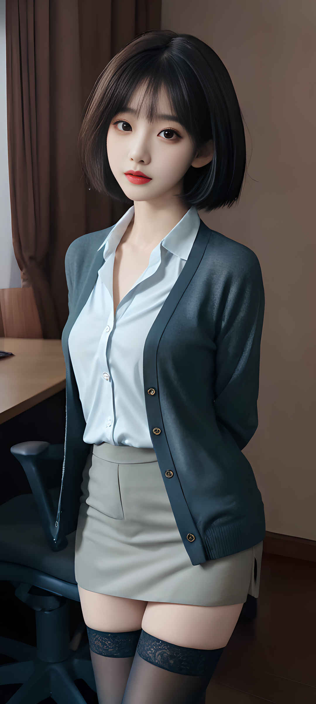 短发美女 黑色衣服 白色衬衫 ai美女手机壁纸-